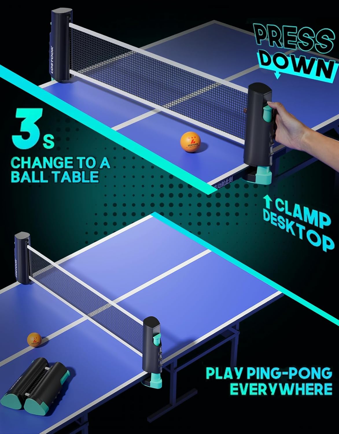 | Included Components | 1 Ping Pong Paddle Bag, 1 Portable Ping Pong Table Net with Clamps, 2 Gray Color Lostook Ping Pong Paddles, 3 Three-Star Ping Pong Balls |